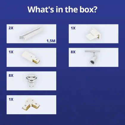 | Manufacturer Name | Complete L shaped 1-Phase Track Set White incl. 8x Spot fixture + GU10 2700K 3W Dim – 1.5 x 1.5 mete | |